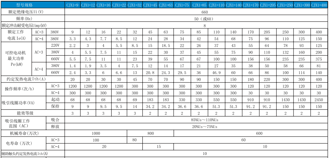 CJX1系列交流接觸器(以下簡(jiǎn)稱接觸器)主要用于交流50Hz(或60Hz),額定絕緣電壓為660V,在AC-3使用類別下額定工作電壓為380V時(shí)額定工作電流為09~400A的電力線路中。作為供遠(yuǎn)距離接通和分?jǐn)嚯娐分茫⑦m用于控制交流電動(dòng)機(jī)的起動(dòng)、停止及反轉(zhuǎn)。