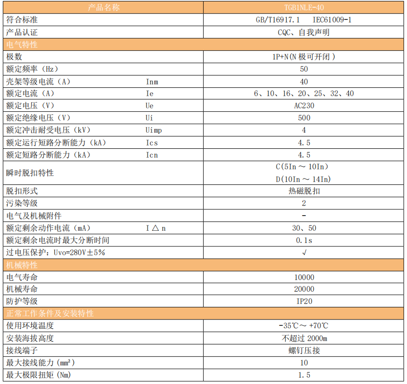 TGB1NLE-40系列剩余電流動作斷路器(以下簡稱漏電斷路器)主要適用于交流 50Hz,額定工作電壓 230V,額定電流至 40A的線路中,當人身觸電或電網泄露電流超過規定值時,剩余電流動作斷路器能在極短的時間內迅速切斷電源,保護人身及用電設備的安全,并且有過載、短路、過壓(TGB1NLG-40)及在正常情況下作為線路的不頻繁轉換之用,尤其適用于工業和商業的照明配電系統。.